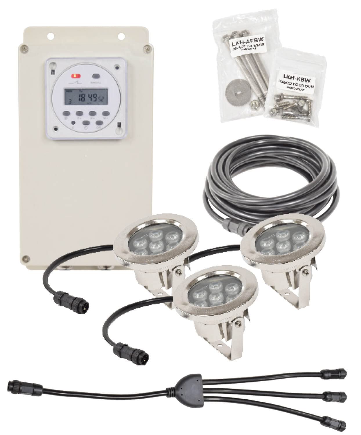 EasyPro WFL3-150 AquaShine Three 11 Watt Warm White LED Stainless Steel Fountain Lights/Digital Timer & Remote Control/for Fountains up to 2 hp / 150′ Power Cord