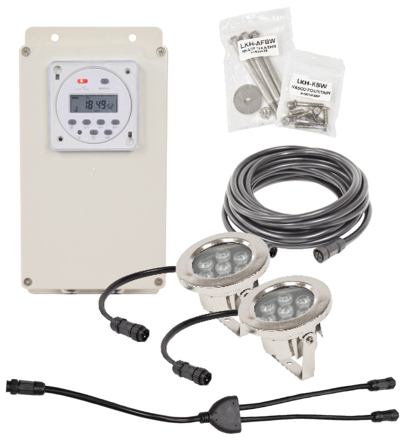 EasyPro Pond Products WFL2-100 AquaShine Two 11 Watt Warm White LED Stainless Steel Fountain Lights/Digital Timer & Remote Control/for Fountains up to 3/4 hp / 100′ Power Cord